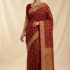 আপনার উৎসবের সাজে আভিজাত্যের ছোঁয়া নিয়ে আসতে আমাদের এই এক্সক্লুসিভ মেরুন শাড়িটি হতে পারে সেরা পছন্দ। গাঢ় মেরুন রঙের ওপর সোনালী জরির নিখুঁত কাজ শাড়িটিকে করে তুলেছে অপরূপ সুন্দর। এর অল-ওভার ফ্লোরাল মোটিফ এবং চওড়া গোল্ডেন পাড় আপনাকে দিবে রাজকীয় লুক।